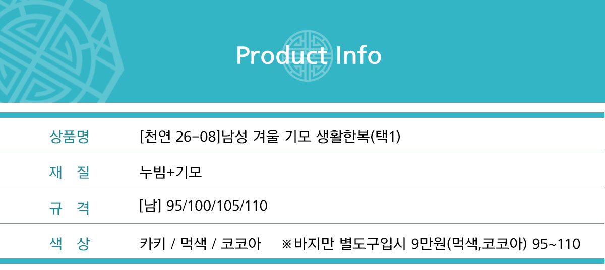 HOME > 천연염색 > 생활한복 > [천연26-08]남성 겨울 기모 생활한복(택1)